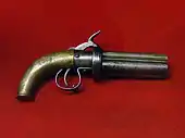 Vers 1830, l'adoption du mécanisme à simple action permet aux canons de tourner automatiquement lorsque l'on arme le chien. En 1837, avec l'invention de l'américain Ethan Allen[2], le mécanisme à double action se généralise. Ce dispositif permet de faire tourner les canons et d'armer le chien en appuyant sur la détente. Le chien n'est plus apparent et se trouve dans l'axe de la détente, il agit sur le canon inférieur.