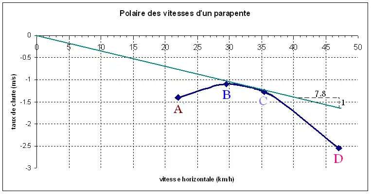 La polaire des vitesses est une courbe qui présente, pour un appareil ou un profil d'aile donné, la vitesse de vol en abscisse (ou un paramètre lié, tel que le coefficient aérodynamique de traînée Cx) et le taux de chute en ordonnée (ou Cz). Elle permet d'avoir un bon aperçu des performances du profil ou de l'appareil. Cette courbe permet de trouver la finesse maximale théorique, en traçant la tangente à la courbe passant par l'origine.
