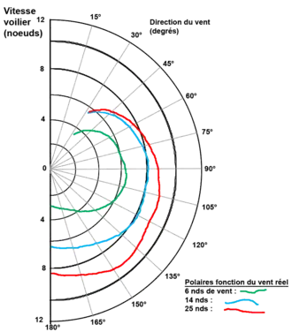 La vitesse du navire est représentée suivant l'angle du vent réel par rapport à la direction de déplacement du voilier : de 0 degré (le vent arrive face au bateau) à 180 degrés (le vent arrive par l'arrière).