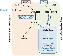 En 1938[20], on découvrit l'association entre le métabolisme cellulaire et inflammation : Il existe un gradient d'oxygène décroissant chez les foyers tissulaires d'inflammation , par rapport au flux sanguin riche en oxygène, conduisant à une augmentation des taux cellulaires de HIF-1α, en particulier dans les phagocytes, et à l'activation des gènes nécessaires au maintien de la viabilité et de l'activité de ces foyers exigeants. conditions (faible teneur en oxygène et en glucose). Le facteur induit par l'hypoxie peut également exercer des effets régulateurs en normoxie, en particulier lors d'une infection bactérienne, où l'expression de HIF-1α est stimulée par l'engagement du récepteur de type Toll et les voies de signalisation cellulaire telles que la voie de signalisation NF-κB et la voie de signalisation MAPK[21].