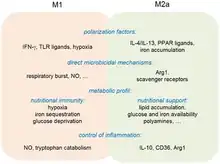 Le concept de polarisation des macrophages a été défini pour la première fois en 1992 avec la découverte que l'interleukine 4 inhibe la production de dérivés réactifs de l'oxygène par les macrophages tout en améliorant l'expression du complexe majeur d'histocompatibilité II et des récepteurs du mannose (CD206) à la surface de leurs cellules[1]. Depuis lors, deux phénotypes opposés et concurrents, souvent appelés macrophages classiquement activés (macrophages M1) et macrophages alternativement activés (macrophages M2) ont été définis et identifiés dans plusieurs contextes physiologiques[2],[3],[4].