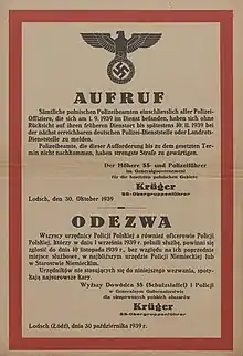 En , le gouverneur général Hans Frank ordonne la mobilisation de la police polonaise d'avant-guerre. Les policiers doivent se présenter au travail ou encourir la peine de mort[4]. Officiellement, la Polnische Polizei (PP) est subordonnée à l'Ordnungspolizei (Orpo) allemande. Les installations d'avant-guerre restent en service dans toute la Pologne occupée, avec la même structure organisationnelle, sous le commandement du major Hans Köchlner, formé en Pologne en 1937[5]. Les policiers portent notamment les mêmes uniformes, mais sans les insignes nationaux[5]. Après l'opération Barbarossa, tous les territoires nouvellement acquis dans le district de Galicie sont placés sous contrôle ukrainien avec siège à Chełm Lubelski[5].