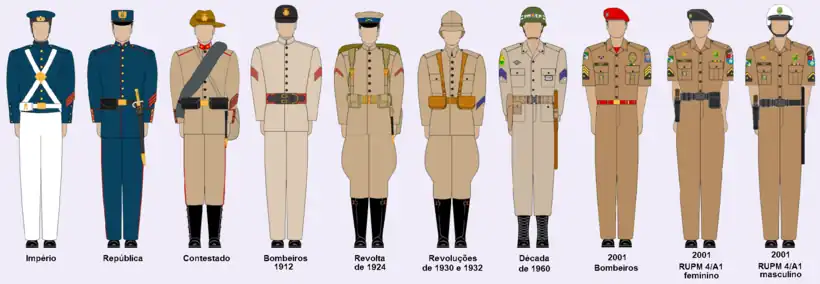 Depuis 1854 jusqu'à ce que les premières années de la République, la PMPR utilisait des uniformes bleus. En 1913 elle a adopté la couleur kaki[4], qui reste en service jusque aujourd'hui. Les pompiers toujours utilisaient le même uniforme de la police militaire, ajoutant, bien sûr, leurs insignes correspondants.