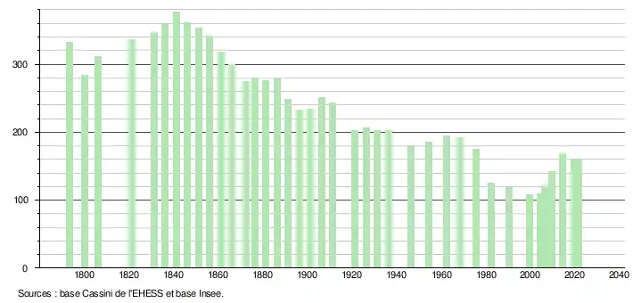 L'évolution du nombre d'habitants est connue à travers les recensements de la population effectués dans la commune depuis 1793. Pour les communes de moins de 10 000 habitants, une enquête de recensement portant sur toute la population est réalisée tous les cinq ans, les populations légales des années intermédiaires étant quant à elles estimées par interpolation ou extrapolation[14]. Pour la commune, le premier recensement exhaustif entrant dans le cadre du nouveau dispositif a été réalisé en 2004[15].