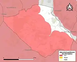 Le retrait-gonflement des sols argileux est susceptible d'engendrer des dommages importants aux bâtiments en cas d’alternance de périodes de sécheresse et de pluie. 84,2 % de la superficie communale est en aléa moyen ou fort (54,2 % au niveau départemental et 48,5 % au niveau national). Sur les 92 bâtiments dénombrés sur la commune en 2019, 91 sont en aléa moyen ou fort, soit 99 %, à comparer aux 57 % au niveau départemental et 54 % au niveau national. Une cartographie de l'exposition du territoire national au retrait gonflement des sols argileux est disponible sur le site du BRGM[11],[Carte 2].