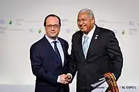 Par ailleurs, le gouvernement Bainimarama à partir des années 2010 fait de la mobilisation de la communauté internationale sur les enjeux du développement durable et la lutte contre le réchauffement climatique le cœur de la politique étrangère fidjienne. Le pays parvient à atteindre une certaine « prééminence dans les affaires mondiales » en étant élu à la présidence du Groupe des 77 pour l'année 2013, devenant le premier pays des îles du Pacifique à présider cette coalition de cent-trente-deux pays en développement aux Nations unies[30]. En 2017, les Fidji, représentées par le Premier ministre Bainimarama, président la COP23, la Conférence des Nations unies de 2017 sur les changements climatiques, consolidant ainsi leur rôle de principal porte-parole des petits États insulaires en développement en matière de lutte contre le réchauffement climatique et ses conséquences[31],[32]. Ainsi la politique étrangère fidjienne dans les années 2010 continue de se caractériser entre autres « par un leadership affirmé dans [sa] région, notamment au sein des petits Etats insulaires en développement, et un fort engagement dans les négociations climatiques depuis 2010 », les Fidji étant d'ailleurs le « premier pays du monde à ratifier l’Accord de Paris en février 2016 » avant de présider la COP23[14].