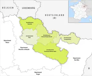 Le département français de la Moselle est un département créé le en application de la loi du , à partir des anciennes provinces de Lorraine, des Trois-Évêchés et de Bar. Les 725 actuelles communes, dont presque toutes sont regroupées en intercommunalités, sont organisées en 25 cantons permettant d'élire les conseillers départementaux. La représentation dans les instances régionales est quant à elle assurée par 31 conseillers régionaux. Le département est également découpé en 9 circonscriptions législatives, et est représenté au niveau national par neuf députés et quatre sénateurs.