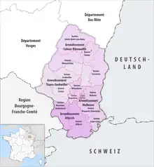 Le département français du Haut-Rhin est un département créé le en application de la loi du , à partir de l'ancienne provinces d'Alsace. Les 366 actuelles communes, dont presque toutes sont regroupées en intercommunalités, sont organisées en 23 cantons permettant d'élire les conseillers alsaciens. La représentation dans les instances régionales est quant à elle assurée par 36 conseillers régionaux. Le département est également découpé en 6 circonscriptions législatives, et est représenté au niveau national par six députés et quatre sénateurs.