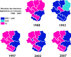 Terre de gauche, la « vague bleue » consécutive à la réélection de Jacques Chirac 2002 avait entraîné l'élection de 4 députés de droite (UMP) contre seulement 2 en 1997. Le « ressac rose » de 2007 permet à 2 de ces circonscriptions (les mêmes qu'en 1997), de repasser à gauche. La réduction du nombre de députés à 6 et la victoire de la gauche à l'élection présidentielle en 2012 occasionnant la disparition de la circonscription de Haute-Corrèze, dite « Chiraquie », et la défaite de Jean Auclair en Creuse, permet au Limousin d'être seulement représenté par des élus socialistes.