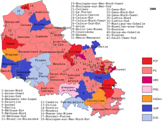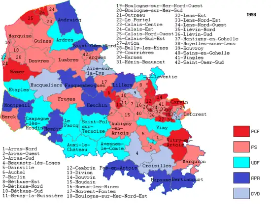 - 2e circonscription : cantons d'Arras-1 (sauf commune de Beaumetz-lès-Loges), Arras-2 (sauf commune de Monchy-le-Preux), Arras-3 (6 communes), Brebières (6 communes), Bully-les-Mines (4 communes) et Liévin (communes de Givenchy-en-Gohelle et Vimy), communes d'Acheville, Bois-Bernard et Duisans.