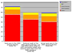 | 2005 | 1 siège 15.8% | 41 sièges 39.5% | 6 sièges 17.7% | 11 sièges 22.6% |