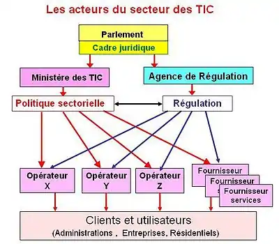 La politique sectorielle doit être distinguée de la régulation des communications électroniques qui consiste à veiller au respect de la réglementation par les opérateurs et fournisseurs de service. La régulation est du ressort d'une autorité de régulation (obligatoirement indépendante de toute influence des opérateurs et fournisseurs et en principe indépendante du Gouvernement).