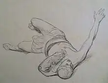 Un gladiateur armé d'un casque, d'une courte épée et d'un bouclier, presse de son pied la carotide d'un jeune rétiaire terrassé, dont le doigt tendu implore grâce. À côté de la loge impériale, les vestales et la foule réclament la mort en tournant le pouce vers le bas (pollice verso)[1].