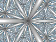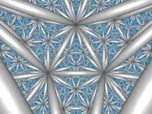 La décomposition d'Epstein-Penner[21] peut être utilisé pour décomposer n'importe quelle 3-variété hyperbolique à points de rebroussements en polyèdres idéaux, et pour représenter la variété résultant du collage de ces polyèdres idéaux. Toute variété pouvant être ainsi décomposée a un nombre fini de représentations[23]. Le revêtement universel de la variété hérite de la même décomposition, qui forme un pavage de polyèdres idéaux. Des exemples de variétés à rebroussements, conduisant ainsi à des pavages, apparaissent naturellement comme les compléments de nœuds de liens hyperboliques, qui ont un point de rebroussement pour chaque composante du lien. Par exemple, le complément du nœud en huit est ainsi associé au pavage tétraédrique d'ordre 6 et le complément des anneaux borroméens est associé de la même manière au pavage octaédrique d'ordre 4. Ces deux pavages, ainsi que trois autres utilisant le cuboctaèdre idéal, le prisme triangulaire et le tétraèdre tronqué, apparaissent dans l'étude des groupes de Bianchi et proviennent de variétés à rebroussements apparaissant comme quotients d'espace hyperbolique par des sous-groupes des groupes de Bianchi. De telles variétés peuvent également être interprétées comme des compléments de lien[24],[25].