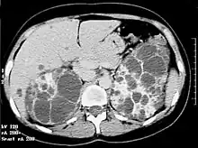 Le scanner n'est pas nécessaire en première intention, même s'il visualise parfaitement les kystes, qu'ils soient rénaux ou hépatiques. l'IRM permet de quantifier le volume rénal, ce dernier étant corrélé avec le risque évolutif[16].