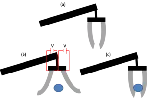 Les polymères électroactifs (PEA) (en anglais : electroactive polymers (EAP)), sont des polymères dont la forme ou la taille changent lorsqu'ils sont stimulés par un champ électrique. L'utilisation principale de ce type de matériau est la fabrication d'actionneurs[1],[2] et de capteurs[3]. Une propriété intéressante des EAP est qu'ils sont capables de grandes déformations, ainsi que de forces importantes. La plus grande partie des actionneurs actuels est fabriquée à partir de céramiques piézo-électriques. Ces matériaux sont certes capables de produire des forces très élevées, cependant leur domaine de déformation n'excède pas quelques pourcents. Durant les années 1990, il a été démontré que certains EAP sont capables d'une déformation de 380 %[1], ce qui est très grandement supérieur à n'importe quelle céramique utilisée actuellement. Une autre application des EAP est dans le développement de la robotique (robotique molle notamment), dans le développement de muscles artificiels. Le fonctionnement d'une pince en EAP est décrit dans la figure 1.