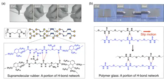 L'une des propriétés fascinantes des polymères supramoléculaires est sa capacité à s'auto-cicatriser en cas de fracture[39]. Un caoutchouc supramoléculaire à base de vitrimères, introduit par Ludwik Leibler, peut s'auto-cicatriser simplement en pressant les deux bords cassés du matériau ensemble[40]. Dans ce cas, des fractures se produisent lorsque les liaisons hydrogène entre les monomères du matériau sont rompues; rapprocher les bords de la fracture permet aux liaisons hydrogène de se reformer, scellant ainsi l'espace. De manière impressionnante, le comportement dynamique des liaisons hydrogène ne compromet pas les propriétés du matériau. La résistance mécanique élevée d'un matériau et la capacité d'auto-cicatrisation s'excluent généralement mutuellement. Ainsi, un matériau vitreux qui peut s'auto-cicatriser à température ambiante est resté un défi jusqu'à récemment. Takuzo Aida a présenté un verre polymère innovant composé d'un éther thiourée oligomérique polymérisé supramoléculairement, qui est mécaniquement robuste ( e = 1,4 GPa) mais peut s'auto-cicatriser, même à température ambiante, juste par une compression au niveau des surfaces fracturées[41]. L'invention du verre polymère auto-cicatrisant a mis à jour l'idée préconçue selon laquelle seuls les matériaux caoutchouteux souples peuvent guérir.