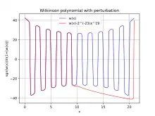 Exemple de mauvais comportement . Pour la racine α20 = 20, la dérivée est égale à −2019/19! ce qui est très grand (environ 4 300 000), donc cette racine est très sensible aux petits changements de t. Les autres racines β sont proches de α20, dans le sens où |β − α20| = 1, 2, 3, ..., 19 est inférieur à |α20| = 20. Pour t = −2−23, l'approximation du premier ordre 20 − t × 2019/19! = 25,137... à la racine perturbée 20,84... est très mauvaise ; ceci est encore plus évident pour la racine α19 où la racine perturbée a une grande partie imaginaire mais l'approximation du premier ordre (et d'ailleurs toutes les approximations d'ordre supérieur) sont réelles. La raison de cet écart est que |t| ≈ 0,000000119 est supérieur au rayon de convergence de la série entière mentionnée ci-dessus (qui est d'environ 0,0000000029, légèrement inférieur à la valeur 0,00000001 donnée par l'estimation brute), donc l'approximation linéaire ne s'applique pas. Pour une valeur telle que t = 0,000000001 qui est nettement inférieure à ce rayon de convergence, l'approximation du premier ordre 19,9569... est raisonnablement proche de la racine 19,9509...