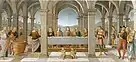 Les paysages en arrière-plan sont extrêmement simplifiés, sans prés ni fleurs au premier plan, en prévilégiant la centralité des figures et évitant tout motif perturbant. Les figures classiques, que Le Pérugin semble avoir assimilé de son ancien élève Raphaël, émergent solennelles et monumentales[6].
