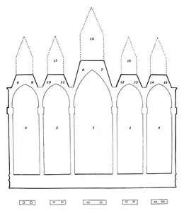 Les phylactères présentés par les prophètes se référent pour chacun à l’image sainte placée en dessous et aussi à la cuspide correspondante ; mais les cuspides ont été perdues et on ne peut plus réaliser une lecture complète du tableau. Mirella Branca a en tout état de cause tenté de reconstruire idéalement les images dans les cuspides manquantes.