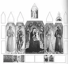 - Le panneau de la Madone, la crucifixion, les pinacles de saint Benoît et l'ange Gabriel et les deux saints à gauche de la Vierge étaient faits dans un premier temps. La peinture a été faite lentement, avec beaucoup de soin.