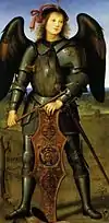 - Les compartiments latéraux montrent respectivement l'archange Michel et l'archange Raphaël avec Tobie.