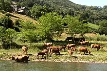 Les observations du Lot[4] dans sa traversée de la commune montrent que l'équilibre des eaux de la rivière reste fragile et cela malgré la mise en place en amont de stations d'épuration qui en améliorent la qualité[5]. L'élévation des températures estivales de l'eau (en partie accentuée par la retenue de Booz située 20 km en amont.) combinée à l'utilisation croissante des intrants auxquels s'ajoutent les déjections des troupeaux qui pâturent sur les bords de la rivière peut parfois provoquer des phénomènes d'eutrophisation. Bien que sur la commune les rives du Lot soient classées en espace naturel sensible, en raison de certains manquements aux procédures, la qualité des eaux ne s'en trouve pas améliorée. Retrouver sur la commune une eau cristalline en période estivale telle qu'elle existait jusqu'au milieu du XXe siècle semble être un défi compliqué à mettre en œuvre.