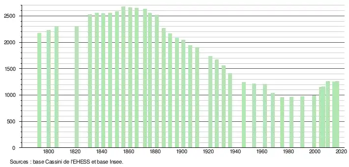 L'évolution du nombre d'habitants est connue à travers les recensements de la population effectués dans la commune depuis 1793. Pour les communes de moins de 10 000 habitants, une enquête de recensement portant sur toute la population est réalisée tous les cinq ans, les populations légales des années intermédiaires étant quant à elles estimées par interpolation ou extrapolation[8]. Pour la commune, le premier recensement exhaustif entrant dans le cadre du nouveau dispositif a été réalisé en 2004[9].