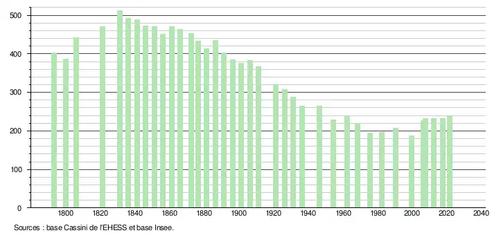 L'évolution du nombre d'habitants est connue à travers les recensements de la population effectués dans la commune depuis 1793. Pour les communes de moins de 10 000 habitants, une enquête de recensement portant sur toute la population est réalisée tous les cinq ans, les populations légales des années intermédiaires étant quant à elles estimées par interpolation ou extrapolation[28]. Pour la commune, le premier recensement exhaustif entrant dans le cadre du nouveau dispositif a été réalisé en 2007[29].