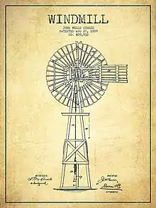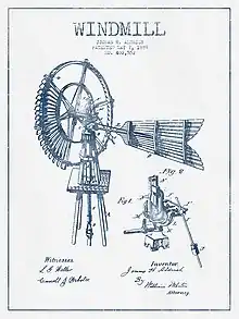 Les premiers immigrants du Nouveau Monde ont apporté d’Europe la technologie des moulins à vent[5]. Dans les fermes américaines, en particulier dans les Grandes Plaines, des pompes à vent ont été utilisées pour pomper l’eau des puits de ferme pour abreuver le bétail. En Californie et dans d’autres États, le moulin à vent faisait partie d’un système autonome d’alimentation en eau domestique, comprenant un puits creusé à la main et un château d’eau constitué d'une tour en bois de séquoias (redwood), soutenant un réservoir fermé par un bardage en séquoia (Tankhouse (en)). La pompe éolienne agricole auto-régulée a été inventée par Daniel Halladay (en) en 1854[6],[7]. Finalement, des pales en acier et des pylônes en acier ont remplacé la construction en bois et, à leur apogée en 1930, environ 600 000 unités étaient utilisées, avec une puissance moyenne de 250 Watt, soit un total de 150 mégawatts[8]. De très grandes éoliennes en Australie, plus légères, couplent directement le rotor de l’éolienne avec la pompe. Un engrenage arrière supplémentaire entre les petits rotors, pour les zones de grand vent, et la manivelle de la pompe, entravent la course descendante des tiges ; les tiges descendent plus lentement qu'elles ne tomberaient par gravité. En effet, un pompage trop rapide entraînerait le flambage des tiges de pompe, ce qui provoquerait des fuites au niveau du presse-étoupe et une usure de la paroi de la colonne montante (UK: rising main, US: drop-pipe), de sorte que toute puissance serait perdue.