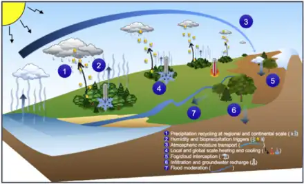 - En fournissant des précipitations, la végétation peut survivre et éventuellement prospérer, perpétuant ainsi la couverture forestière. Les zones forestières ont un climat plus modéré grâce au refroidissement par transpiration et à l'ombre. La pénétration de la lumière dans le sol de la forêt peut être aussi faible que 1 % par rapport aux zones adjacentes déboisées[7]. Dans les zones où les terres déboisées sont plus nombreuses, la conversion de l'énergie radiante en chaleur sensible augmente. Les zones forestières sont nettement plus fraîches que la végétation clairsemée ou la terre nue[8].