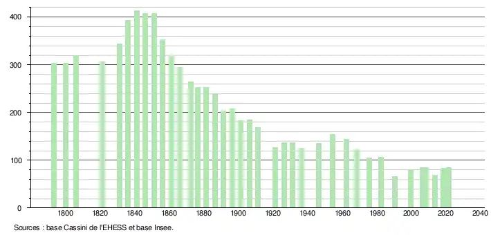L'évolution du nombre d'habitants est connue à travers les recensements de la population effectués dans la commune depuis 1793. Pour les communes de moins de 10 000 habitants, une enquête de recensement portant sur toute la population est réalisée tous les cinq ans, les populations légales des années intermédiaires étant quant à elles estimées par interpolation ou extrapolation[13]. Pour la commune, le premier recensement exhaustif entrant dans le cadre du nouveau dispositif a été réalisé en 2008[14].