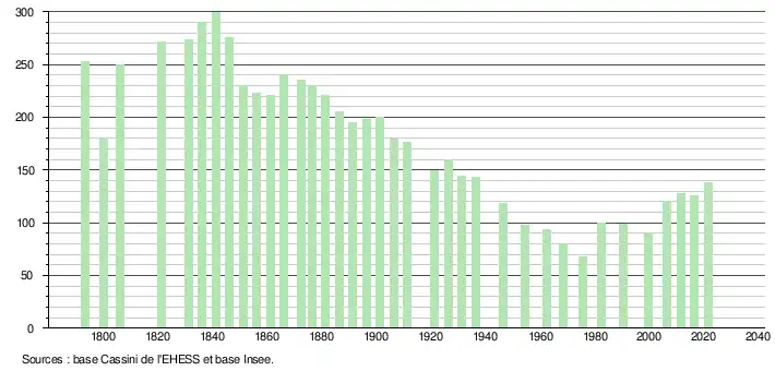 L'évolution du nombre d'habitants est connue à travers les recensements de la population effectués dans la commune depuis 1793. Pour les communes de moins de 10 000 habitants, une enquête de recensement portant sur toute la population est réalisée tous les cinq ans, les populations légales des années intermédiaires étant quant à elles estimées par interpolation ou extrapolation[18]. Pour la commune, le premier recensement exhaustif entrant dans le cadre du nouveau dispositif a été réalisé en 2006[19].