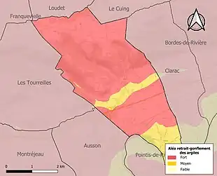 Le retrait-gonflement des sols argileux est susceptible d'engendrer des dommages importants aux bâtiments en cas d’alternance de périodes de sécheresse et de pluie. La totalité de la commune est en aléa moyen ou fort (88,8 % au niveau départemental et 48,5 % au niveau national). Sur les 279 bâtiments dénombrés sur la commune en 2019, 279 sont en aléa moyen ou fort, soit 100 %, à comparer aux 98 % au niveau départemental et 54 % au niveau national. Une cartographie de l'exposition du territoire national au retrait gonflement des sols argileux est disponible sur le site du BRGM[37],[Carte 3].