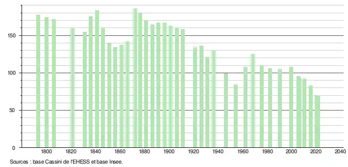 L'évolution du nombre d'habitants est connue à travers les recensements de la population effectués dans la commune depuis 1793. Pour les communes de moins de 10 000 habitants, une enquête de recensement portant sur toute la population est réalisée tous les cinq ans, les populations légales des années intermédiaires étant quant à elles estimées par interpolation ou extrapolation[31]. Pour la commune, le premier recensement exhaustif entrant dans le cadre du nouveau dispositif a été réalisé en 2005[32].