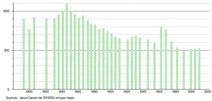 - Dans le tableau des recensements et le graphique, par convention dans Wikipédia, le principe a été retenu, pour les populations légales postérieures à 1999 de n’afficher dans le tableau des recensements et le graphique que les populations correspondant à l'année 2006, première population légale publiée calculée conformément aux concepts définis dans le décret no 2003-485 du 5 juin 2003, et les années correspondant à une enquête exhaustive de recensement pour les communes de moins de 10 000 habitants, ainsi que la dernière population légale publiée par l’Insee.