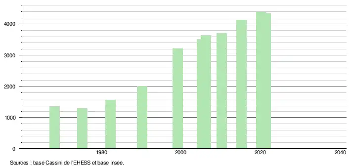 L'évolution du nombre d'habitants est connue à travers les recensements de la population effectués dans la commune depuis 1968. Pour les communes de moins de 10 000 habitants, une enquête de recensement portant sur toute la population est réalisée tous les cinq ans, les populations légales des années intermédiaires étant quant à elles estimées par interpolation ou extrapolation[43]. Pour la commune, le premier recensement exhaustif entrant dans le cadre du nouveau dispositif a été réalisé en 2005[44].