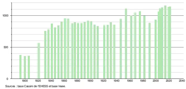 L'évolution du nombre d'habitants est connue à travers les recensements de la population effectués dans la commune depuis 1793. Pour les communes de moins de 10 000 habitants, une enquête de recensement portant sur toute la population est réalisée tous les cinq ans, les populations légales des années intermédiaires étant quant à elles estimées par interpolation ou extrapolation[24]. Pour la commune, le premier recensement exhaustif entrant dans le cadre du nouveau dispositif a été réalisé en 2004[25].