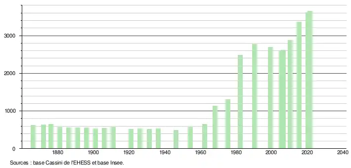 L'évolution du nombre d'habitants est connue à travers les recensements de la population effectués dans la commune depuis 1866. Pour les communes de moins de 10 000 habitants, une enquête de recensement portant sur toute la population est réalisée tous les cinq ans, les populations légales des années intermédiaires étant quant à elles estimées par interpolation ou extrapolation[20]. Pour la commune, le premier recensement exhaustif entrant dans le cadre du nouveau dispositif a été réalisé en 2005[21].