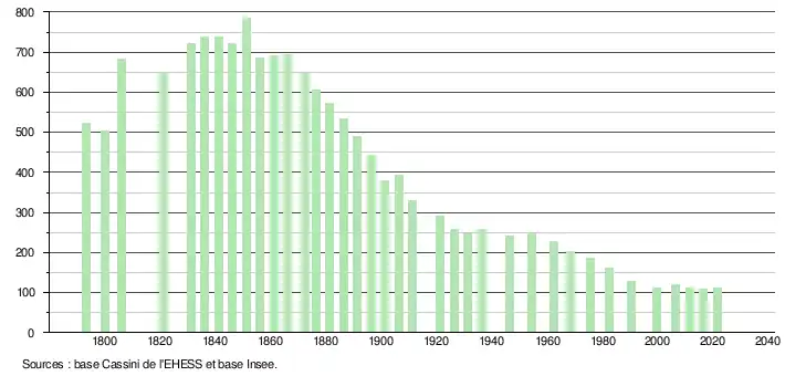 L'évolution du nombre d'habitants est connue à travers les recensements de la population effectués dans la commune depuis 1793. Pour les communes de moins de 10 000 habitants, une enquête de recensement portant sur toute la population est réalisée tous les cinq ans, les populations légales des années intermédiaires étant quant à elles estimées par interpolation ou extrapolation[17]. Pour la commune, le premier recensement exhaustif entrant dans le cadre du nouveau dispositif a été réalisé en 2006[18].