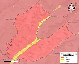 Le retrait-gonflement des sols argileux est susceptible d'engendrer des dommages importants aux bâtiments en cas d’alternance de périodes de sécheresse et de pluie[23]. La totalité de la commune est en aléa moyen ou fort (91,8 % au niveau départemental et 48,5 % au niveau national)[Carte 2]. Depuis le , en application de la loi ELAN, différentes contraintes s'imposent aux vendeurs, maîtres d'ouvrages ou constructeurs de biens situés dans une zone classée en aléa moyen ou fort[Note 3],[24].