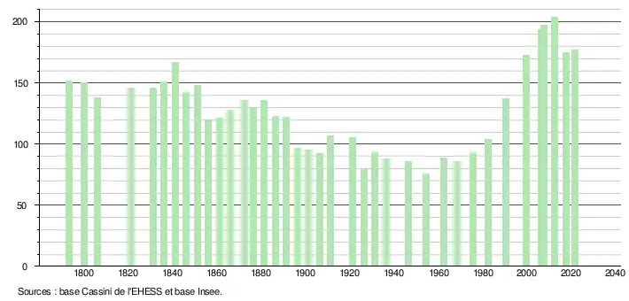 L'évolution du nombre d'habitants est connue à travers les recensements de la population effectués dans la commune depuis 1793. Pour les communes de moins de 10 000 habitants, une enquête de recensement portant sur toute la population est réalisée tous les cinq ans, les populations légales des années intermédiaires étant quant à elles estimées par interpolation ou extrapolation[16]. Pour la commune, le premier recensement exhaustif entrant dans le cadre du nouveau dispositif a été réalisé en 2007[17].