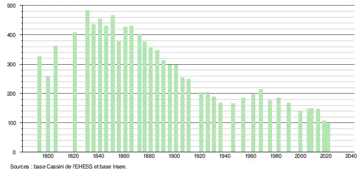 L'évolution du nombre d'habitants est connue à travers les recensements de la population effectués dans la commune depuis 1793. Pour les communes de moins de 10 000 habitants, une enquête de recensement portant sur toute la population est réalisée tous les cinq ans, les populations légales des années intermédiaires étant quant à elles estimées par interpolation ou extrapolation[18]. Pour la commune, le premier recensement exhaustif entrant dans le cadre du nouveau dispositif a été réalisé en 2008[19].