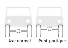 Le pont-portique est une technologie tout-terrain dans laquelle le pont est au dessus du centre de la roue avec un réducteur de boite de vitesses dans le moyeu[1]. Cela donne deux avantages qui accroissent les capacités tout-terrain du véhicule : la garde au sol est augmentée, particulièrement sous le différentiel surbaissé contenant l'axe principal ; et l'engrenage du moyeu permet d'ajuster la puissance et le couple entre la roue et la boite de vitesses.
