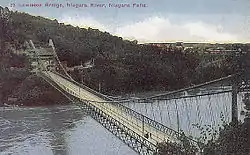 Le premier pont Queenston–Lewiston, construit en 1851 par l'ingénieur Edward Serrell, est détruit en 1864 (ou 1854[2]) par le vent. Quelques câbles sont restés en place jusqu'en 1895[3]. La travée de la rue était environ de 256 à 259 mètres. La conception de ce pont suspendu était inusitée parce que les câbles étaient attachés à l'escarpement qu'avec deux petites tours. Cela faisait que la travée de la rue était plus courte que les câbles, d'une longueur de 317 mètres.