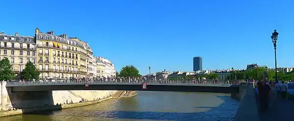 Conformément à la loi du 24 ventôse an IX (), la construction d'un nouveau pont appelé « pont de la Cité » est entreprise en 1803 et achevée en 1804, sous la direction de l’ingénieur Dumoustier[2]. Les culées et les piles sont en pierre, et le cintre en fer revêtu en bois, il est à deux arches, de 70 mètres de long sur 10 mètres de large, essentiellement en chêne. Il ne servait qu'aux gens à pied et chaque personne payait 5 centimes[2]. Ayant subi un affaissemement en 1809, on lui substitua une simple passerelle en charpente, avant de le démolir en 1811[5] et de le remplacer par une passerelle en bois à deux arches[6].