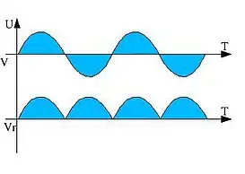 En réalité, le pont de diode est un redresseur de courant. Le courant de sortie est toujours la valeur absolue du courant d'entrée. En revanche la forme de la tension de sortie dépend à la fois de la forme de la tension d'entrée et de la nature de la charge.
