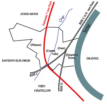 L'ancienne voie romaine, la via romana des plateaux, quitte à Juvisy le plateau surplombant la Seine et l'Orge : devenue aujourd'hui la Nationale 7, elle accuse une pente en courbe avant de traverser l'Orge grâce au Pont des Belles Fontaines, puis elle s'engage dans la plaine de la Seine en traversant Viry-Châtillon.
