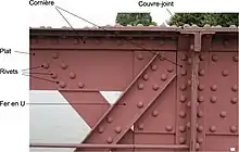 Les assemblages rivés étaient les types d'assemblages les plus courants avant que le soudage ne se généralise. Les ponts à poutres droites comme les ponts à poutres en treillis étaient rivés. La photo ci-contre présente un assemblage typique de poutre en treillis. Les montants verticaux et horizontaux sont constitués de cornières et de plats rivés ensemble. les montants inclinés sont constitués de fers en U. À la jonction de chaque assemblage, des plats sont ajoutés, appelés couvre-joints, pour rigidifier la structure.
