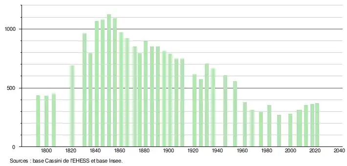 L'évolution du nombre d'habitants est connue à travers les recensements de la population effectués dans la commune depuis 1793. Pour les communes de moins de 10 000 habitants, une enquête de recensement portant sur toute la population est réalisée tous les cinq ans, les populations légales des années intermédiaires étant quant à elles estimées par interpolation ou extrapolation[36]. Pour la commune, le premier recensement exhaustif entrant dans le cadre du nouveau dispositif a été réalisé en 2007[37].